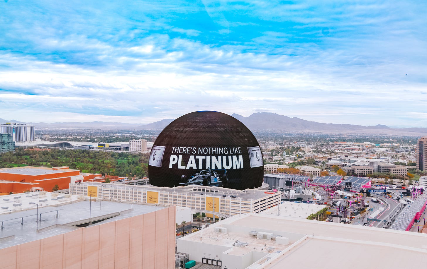 Being at the breathtaking F1 track, which weaved in and out of the city’s streets, it was almost impossible to go anywhere without seeing traces of the American Express brand everywhere. In the F1 Academy paddock was Nicole Hvrada’s car, complete with its Amex platinum card livery which shimmered under the Vegas lights as it tore round the track. The Sphere — just about visible from any vantage point around town, even bore a commercial for Amex. The official F1 merch hub inside The Venetian — which had literally thousands of people queuing for hours in lines that stretched outside the building all weekend — was also sponsored by Amex and featured Amex-exclusive products, including collaborations with brands such as Hello Kitty and Malbon.